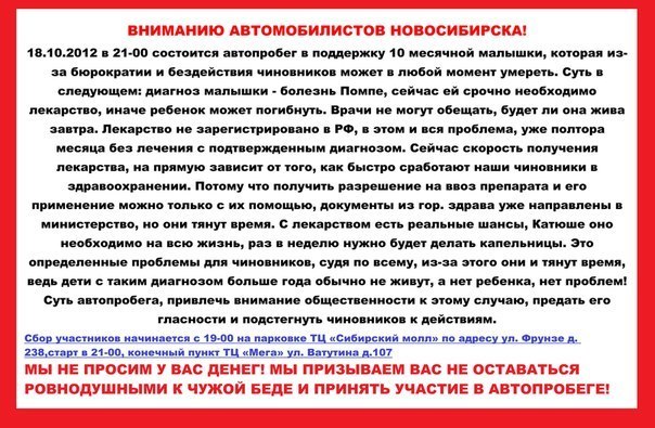 . На наших чиновников воздействовать безполезно, да и пробег в 21.00 кто увидит и заметит? Не дай бог у меня бы что то подобное случилось, я бы продал все что можно и сам бы за бугор съездил за лекарством или нашел бы того кто его мне от туда бы прислал . ИМХО.