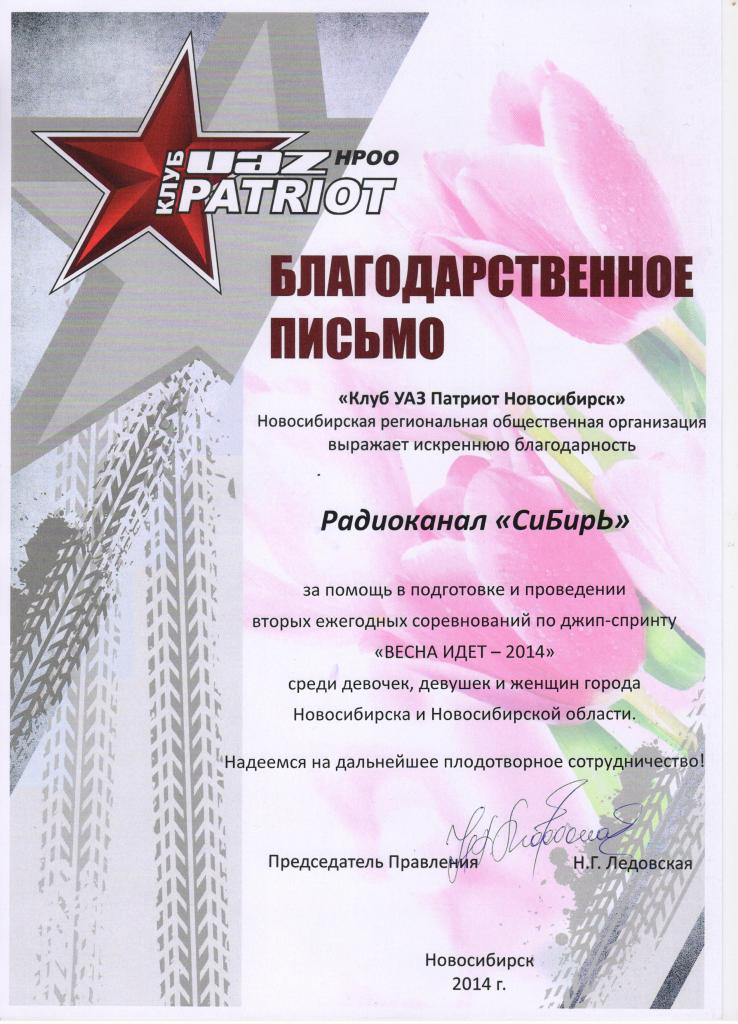 Благодарственное письмо от Патриотоводов.