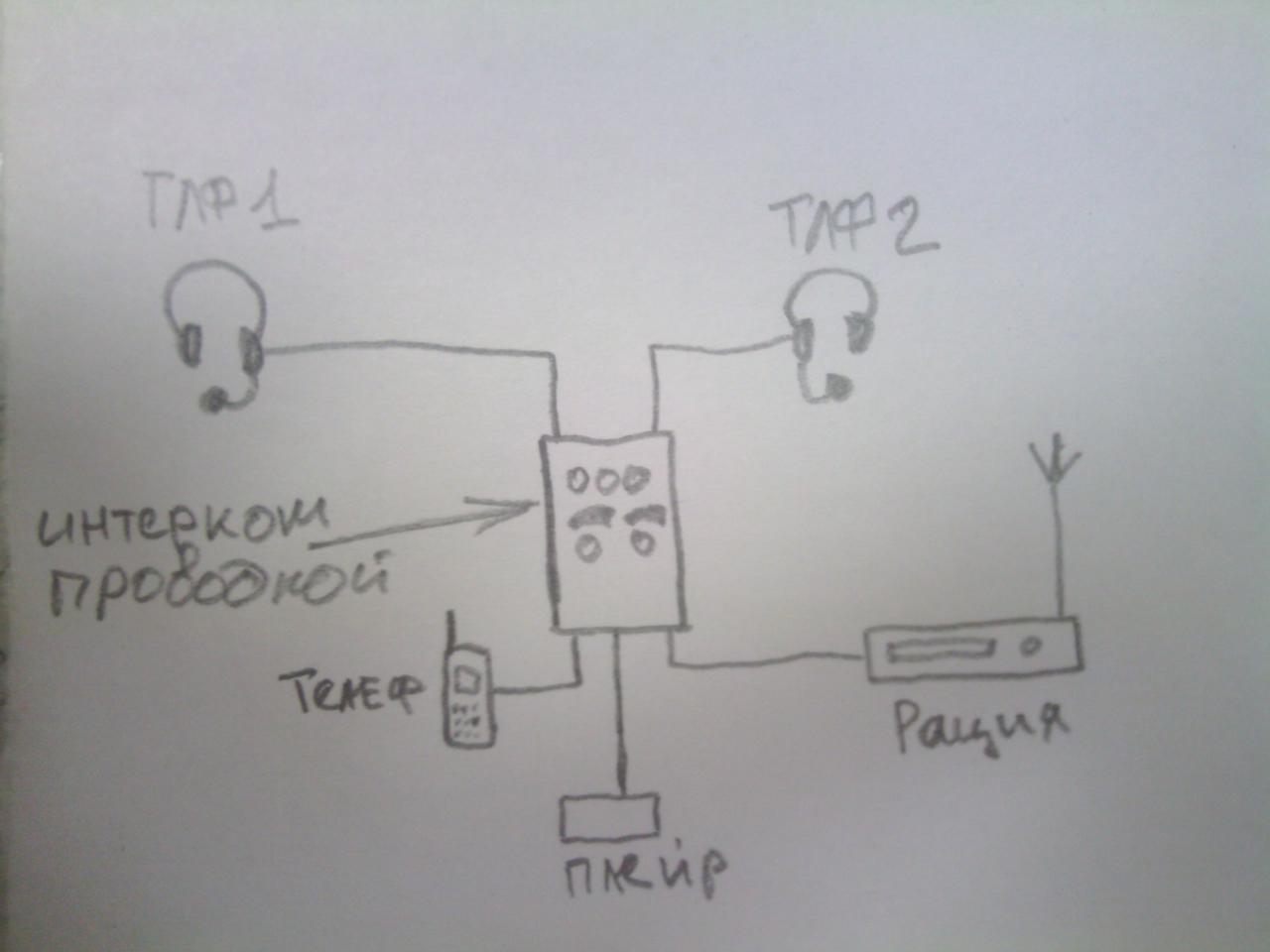 Самолётный вариант называется, например, СПУ-7. Старый танковый вариант называется Р-124. Проводов не так уж много. Питание можно от 12 В - от борта. Но либо это дорого (комплект), либо паять всё это должен специалист. Кратко - нужно подать звук от всех микрофонов на вход микрофонного усилителя (одного хватит на всех), а выход с этого усилителя подать на наушники всем. Можно, конечно, просто снять всё со списанного танка (там на 27 В, но и от 12 В вроде работает). Чтобы не было "шума ветра и дыхания" там применяются ларингофоны. Старинные "угольные" ларингофоны сильно шумят. Те, что с 70ых годов на всех танках и БТР - очень хорошие. Хотя голос искажается очень непривычно, конечно. Можно в качестве ларингофонов применять микрофоны ДЭМШ, закрытые с одной стороны. Можно вообще не использовать ларингофоны - если шумы не так жу громки. Микрофоны для повышенной шумности (ДЭМШ - лучший пример) имеют "дырочки" с двух противоположных сторон, за счёт этого шум давит на мембрану примерно одинаково с двух сторон сразу и "вычитается", а голос (близкий) идёт на мембрану с одной стороны и "мощно слышен" в переговорнике. Картинка ДЭМШ в приложении. ДЭМШ стоит рублей 50...200. Вопрос в первую очередь в подходящем микрофонном усилителе, к которому можно подключать наушники.