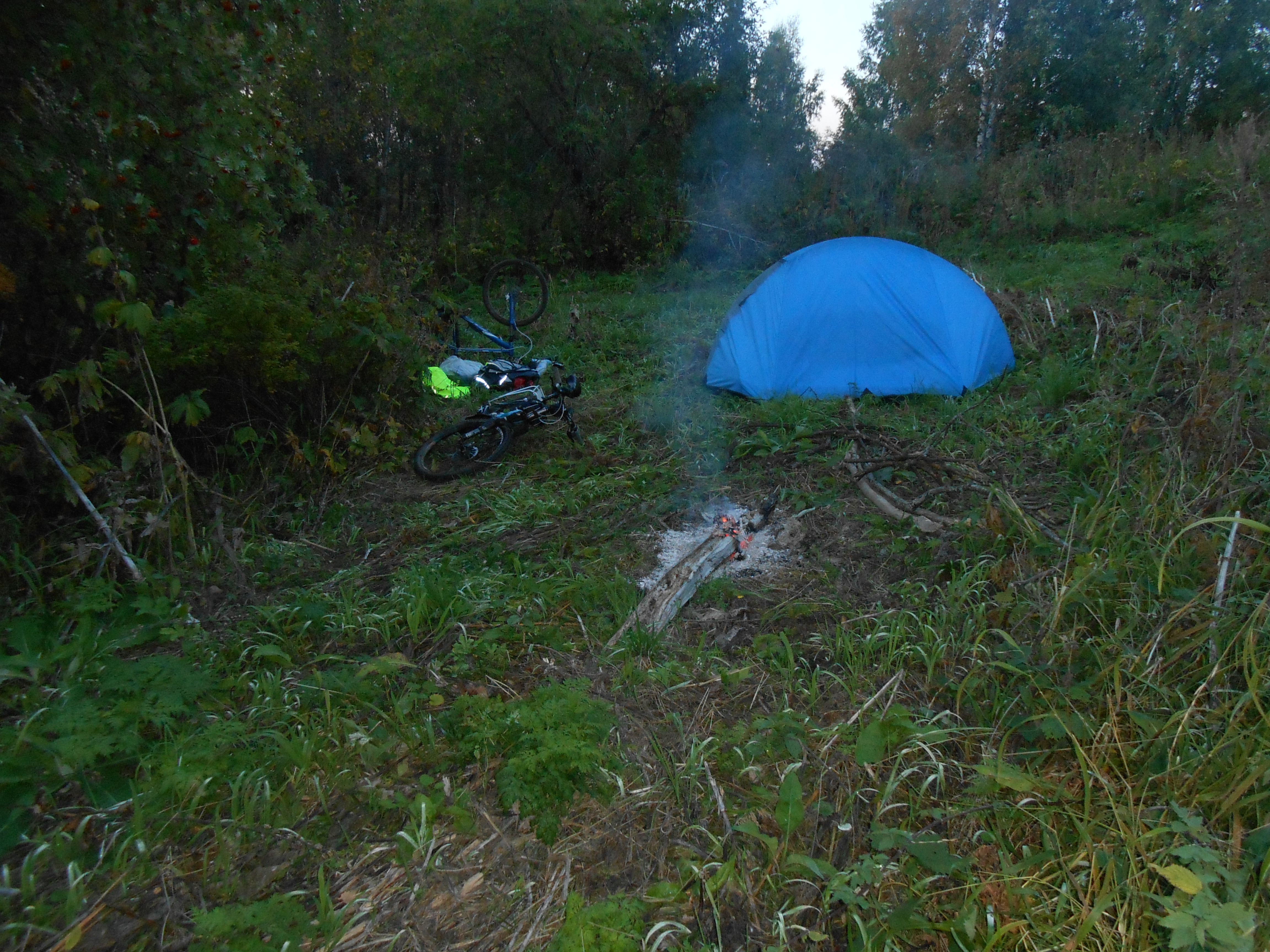 На ночь встали на горе, немного спустившись с вершины, поближе к дровам и подальше от ветра. Вечер у костра, звёздное небо и летящие по нему спутники. Я убеждал Артёма, что инопланетян не существует. Что люди-это единственные разумные существа во вселенной и т. д. При этом у нас не было с собой ни грамма спиртного. Вечер был настолько тёплым и тихим, что я чуть не остался ночевать у костра под открытым небом. Но здравый смысл пересилил лень и спать я пошёл в палатку. Естественно, что это я правильно сделал. После двенадцати ночи даже в палатке конкретно похолодало.