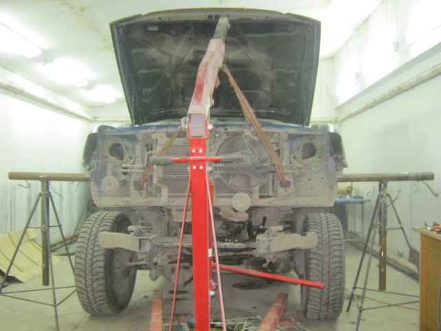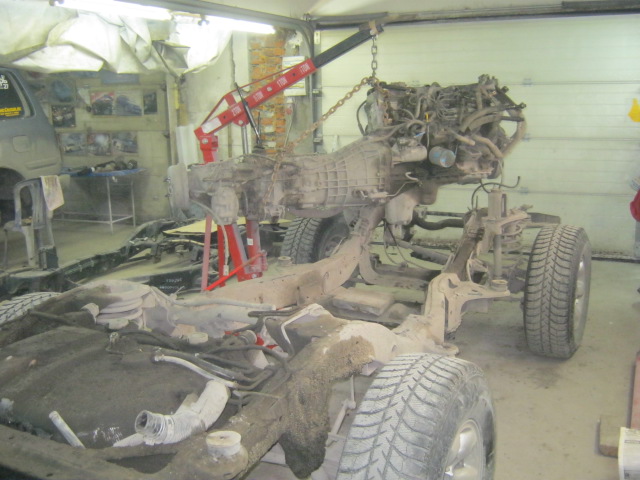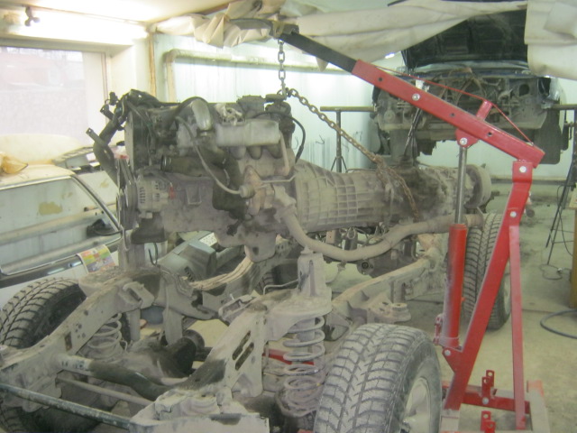Снимаем оба бампера, фары, решётку радиатора, сливаем все тех. жидкости, отсоединяем всё от двигателя в моторном отсеке: топливные трубки, охлаждение, печку, проводку, рулевой вал от редуктора, гидроусилитель, кодиционер: Снимаем правое переднее колесо, снимаем защиту, отсоединяем тормозные трубки и трубку сцепления и проводку датчика ABS: Снимаем левое переднее колесо, снимаем защиту, отсоединяем тормозную трубку, датчик ABS, трубки сапунов коробок: Снимаем заднее правое колесо: Снимаем защиту, отсоединяем топливные трубки от бака к горловине: Отсоединяем проводку на раме и ручник: Тщательно три раза проверяем всё ли отсоединили, откручиваем кузов от рамы и начинаем подъем, ВИРА ПО МАЛУ: Продолжение следует.....