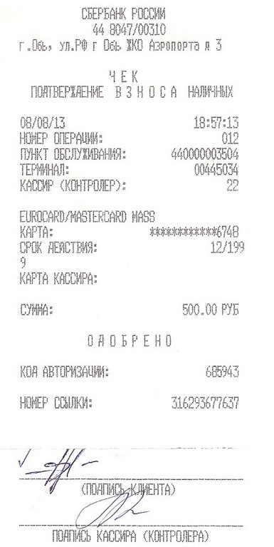 ECMC6748: 02.08.13 07:42 операция зачисления на сумму 500.00 руб. SBOL s karty 4276****5268 выполнена успешно. Доступно: 1900.01 руб.