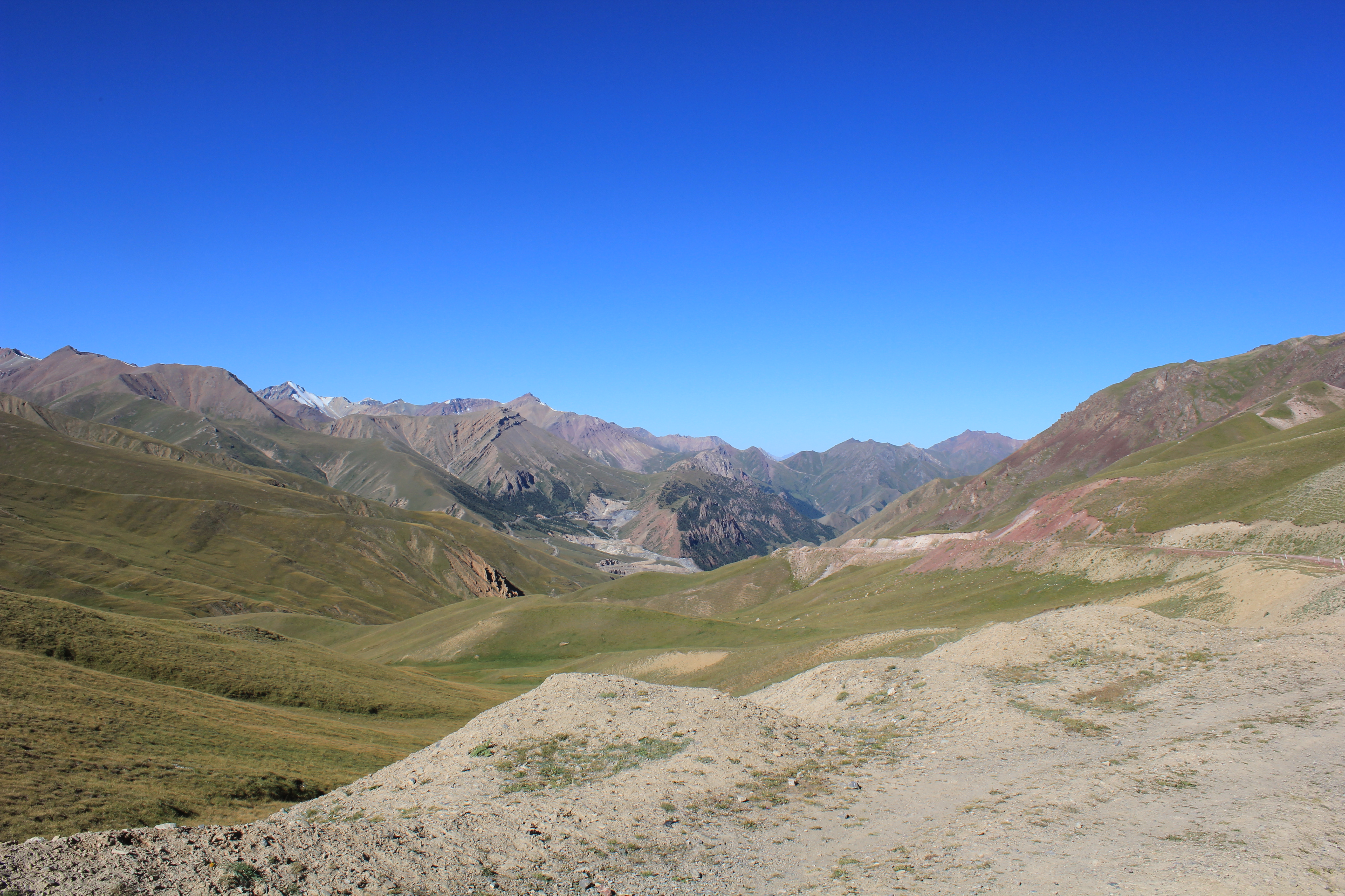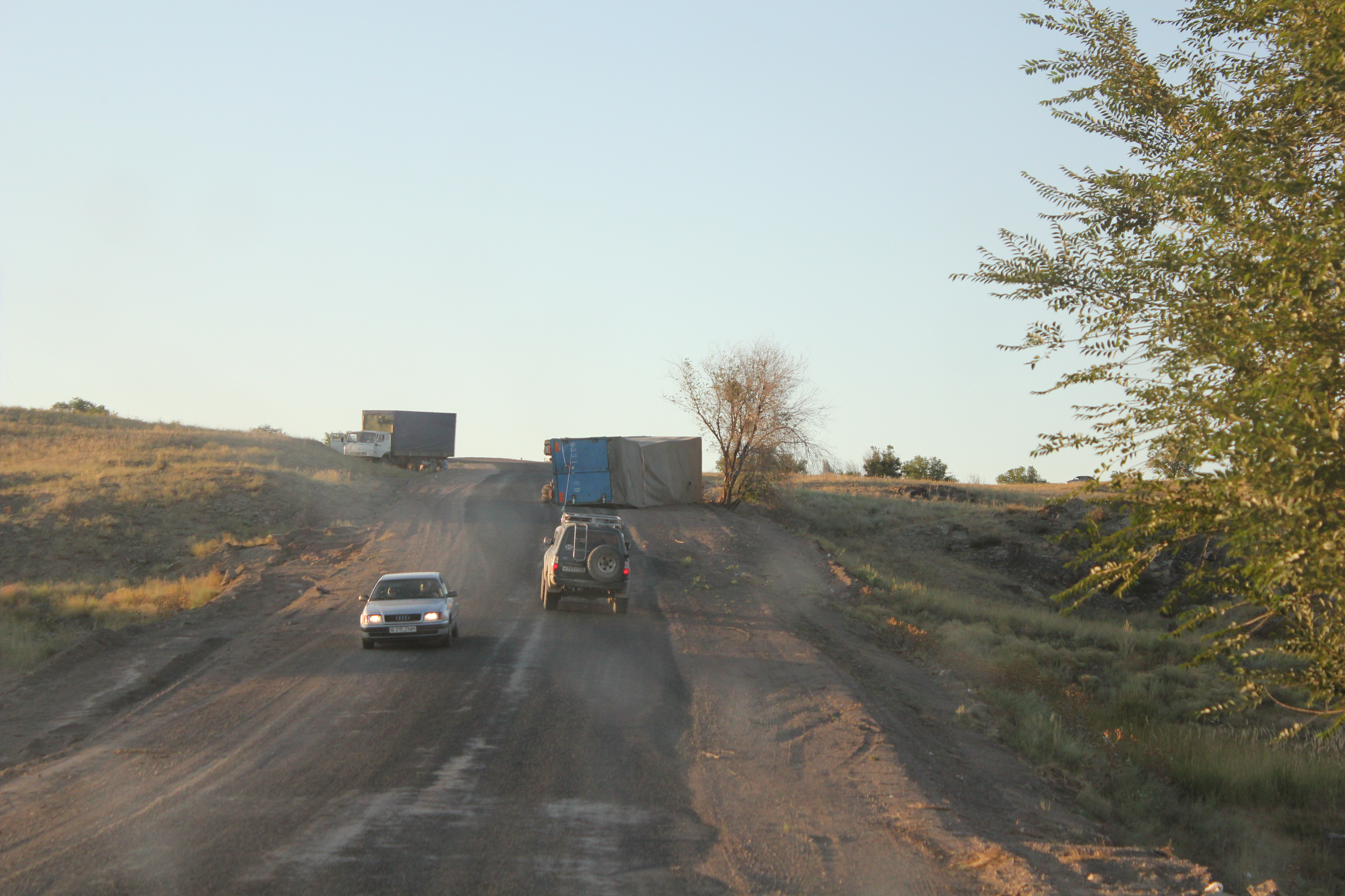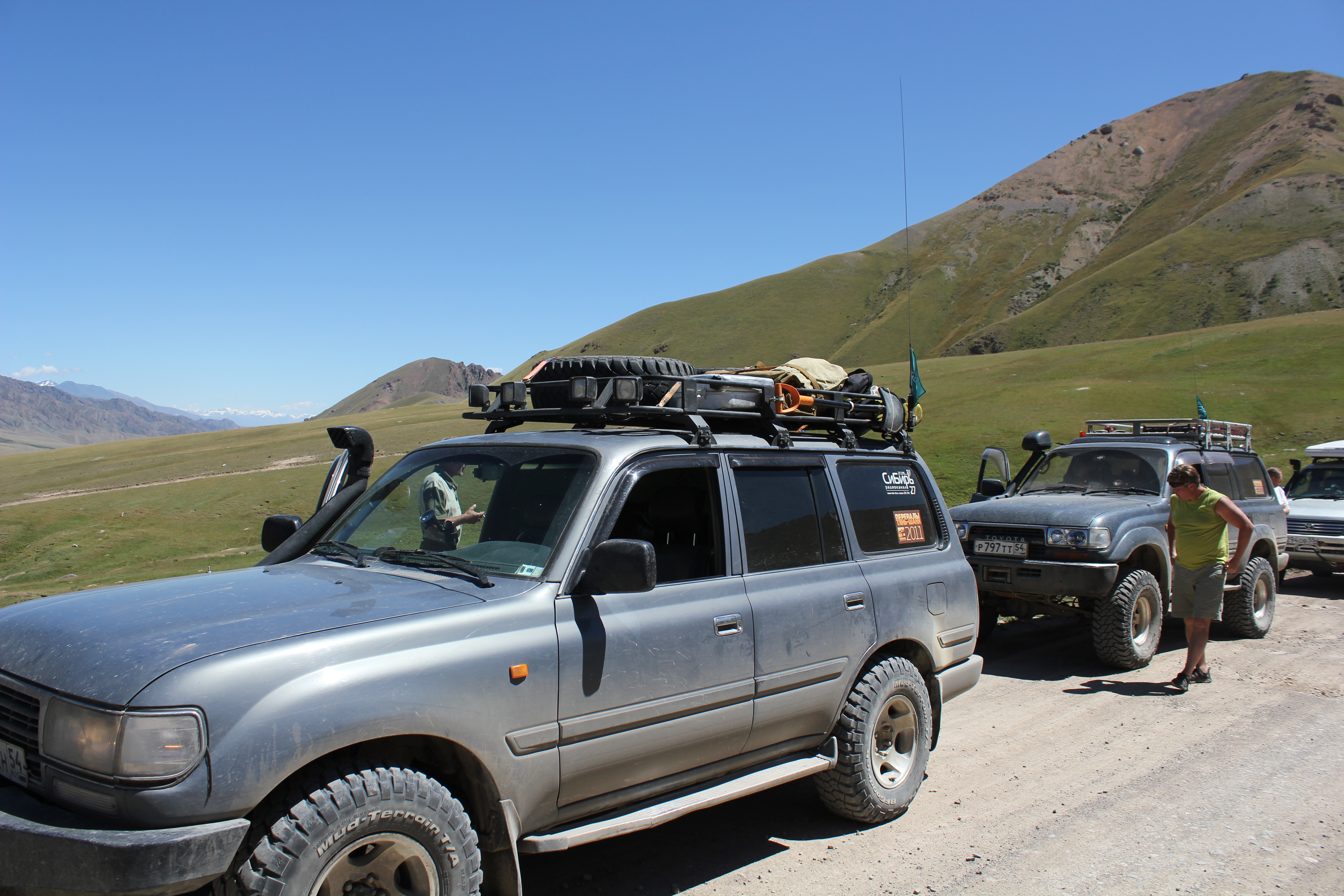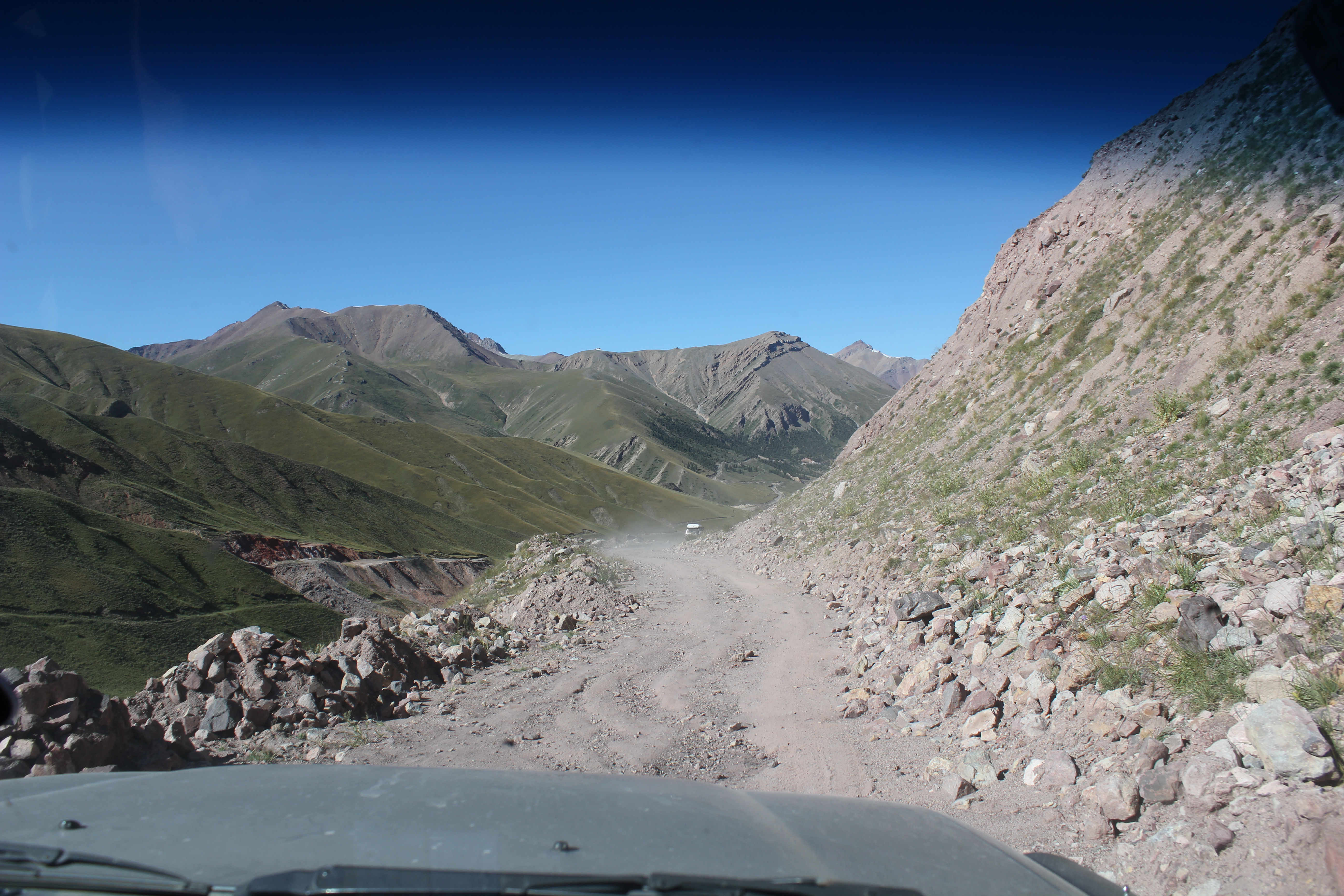 перевал Тюя-Ашу, пришлось включать понижающую передачу в раздатке, так как на повышенной не мог заехать, высоко, машина совершенно не тянет и очень сильно греется, поднимался с включенными на всю катушку печками. Перепад высот почти 2 км. А потом длинный-длинный спуск до Кара-Балты почти 30 км едешь вниз. Фуры едут очень медленно. Туннель на вершине перевала почти 2 км длинной, местные там гоняют, совершают бездумные обгоны, не соблюдают никаких правил.