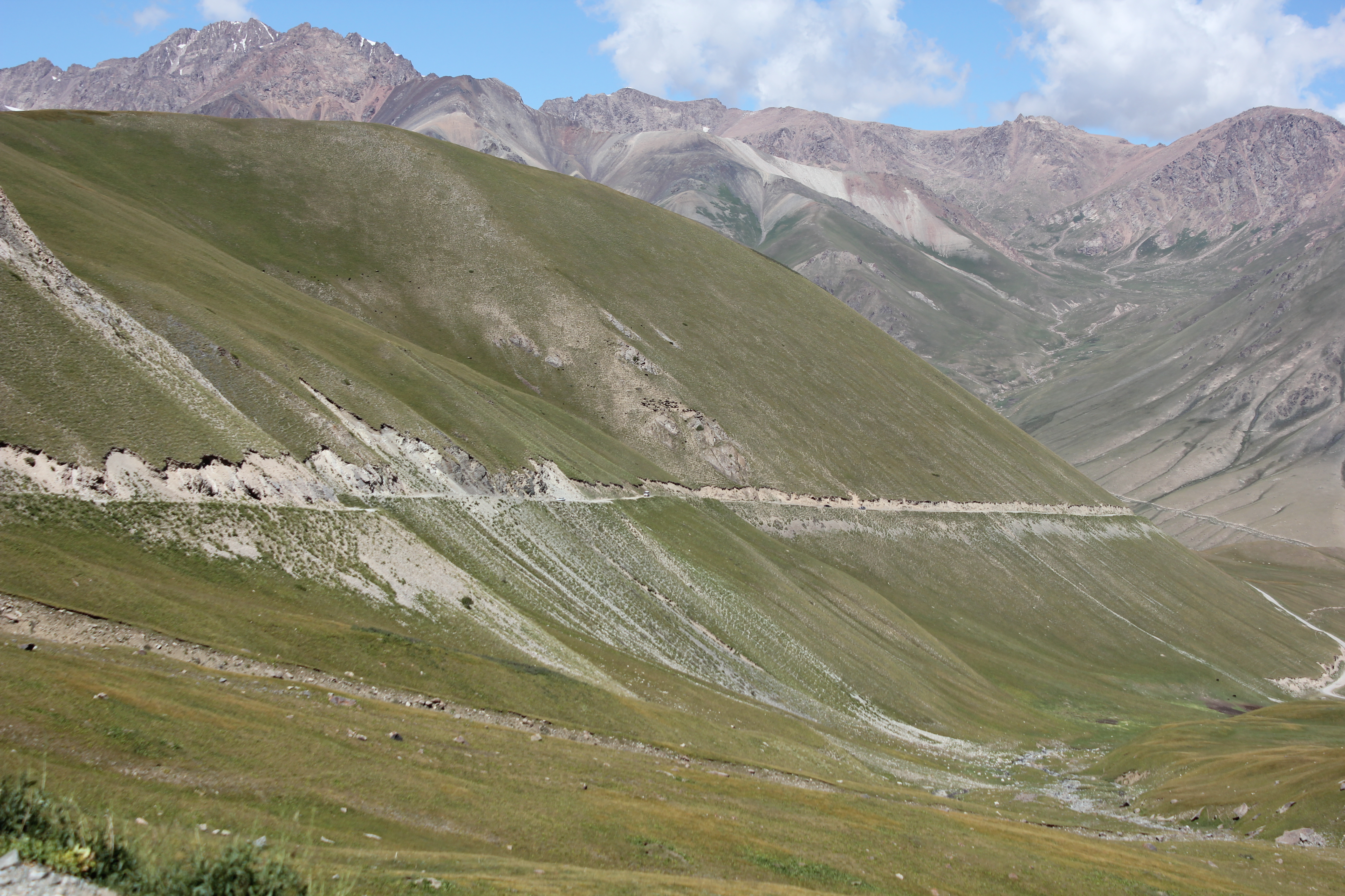 спуск с перевала от озера. Дорога обслуживается, но всё равно - никаких ограждений, часто едешь по самому краю.