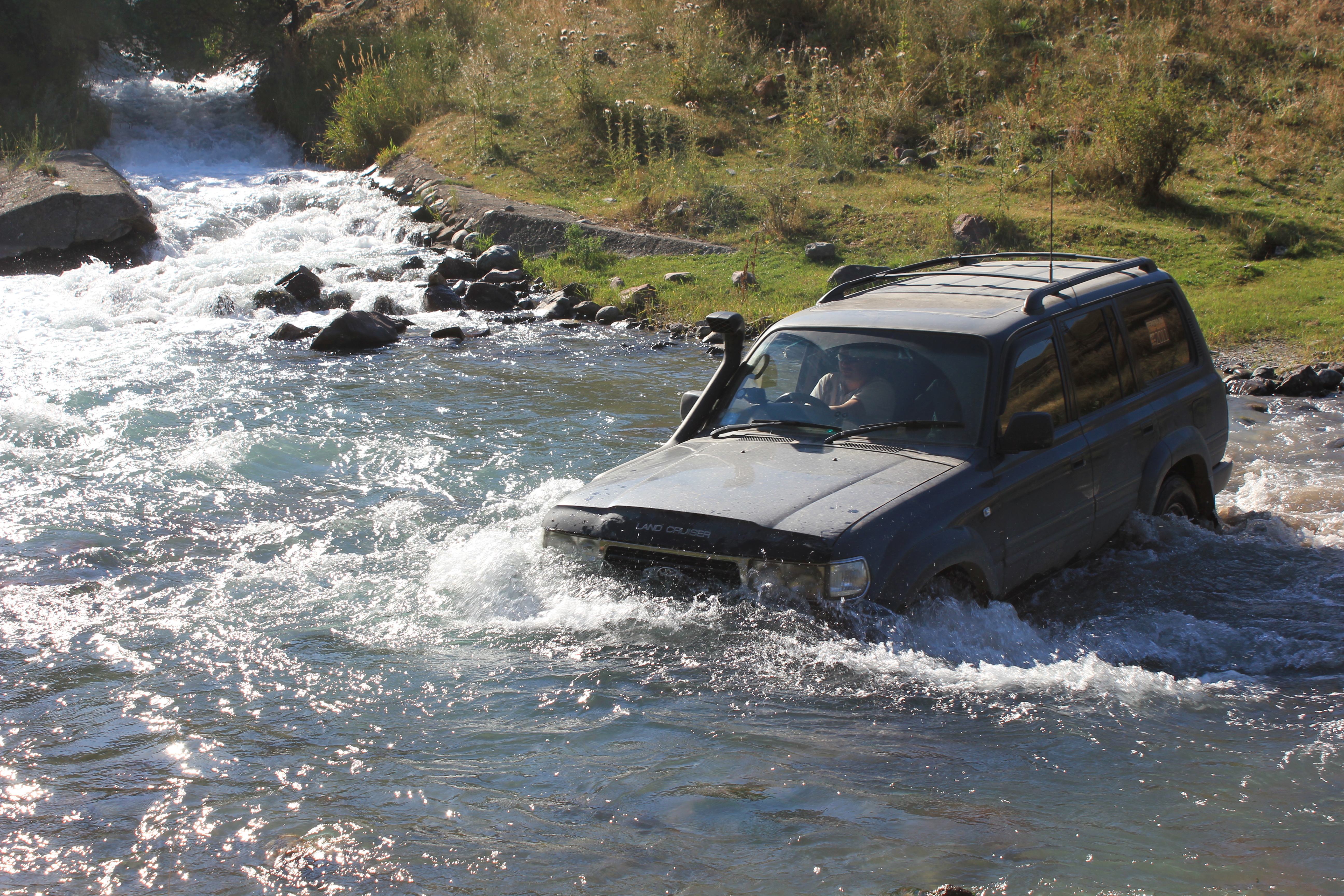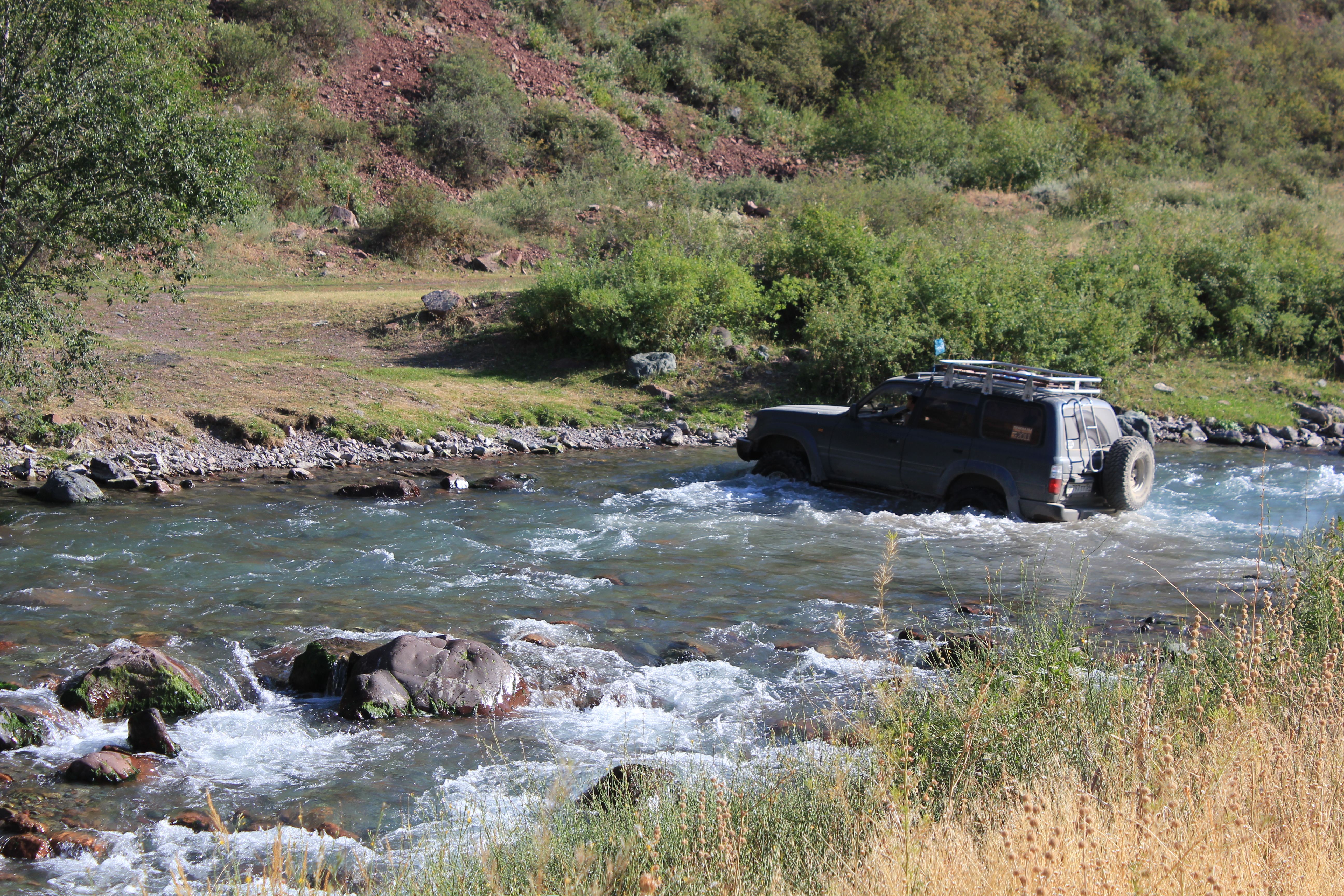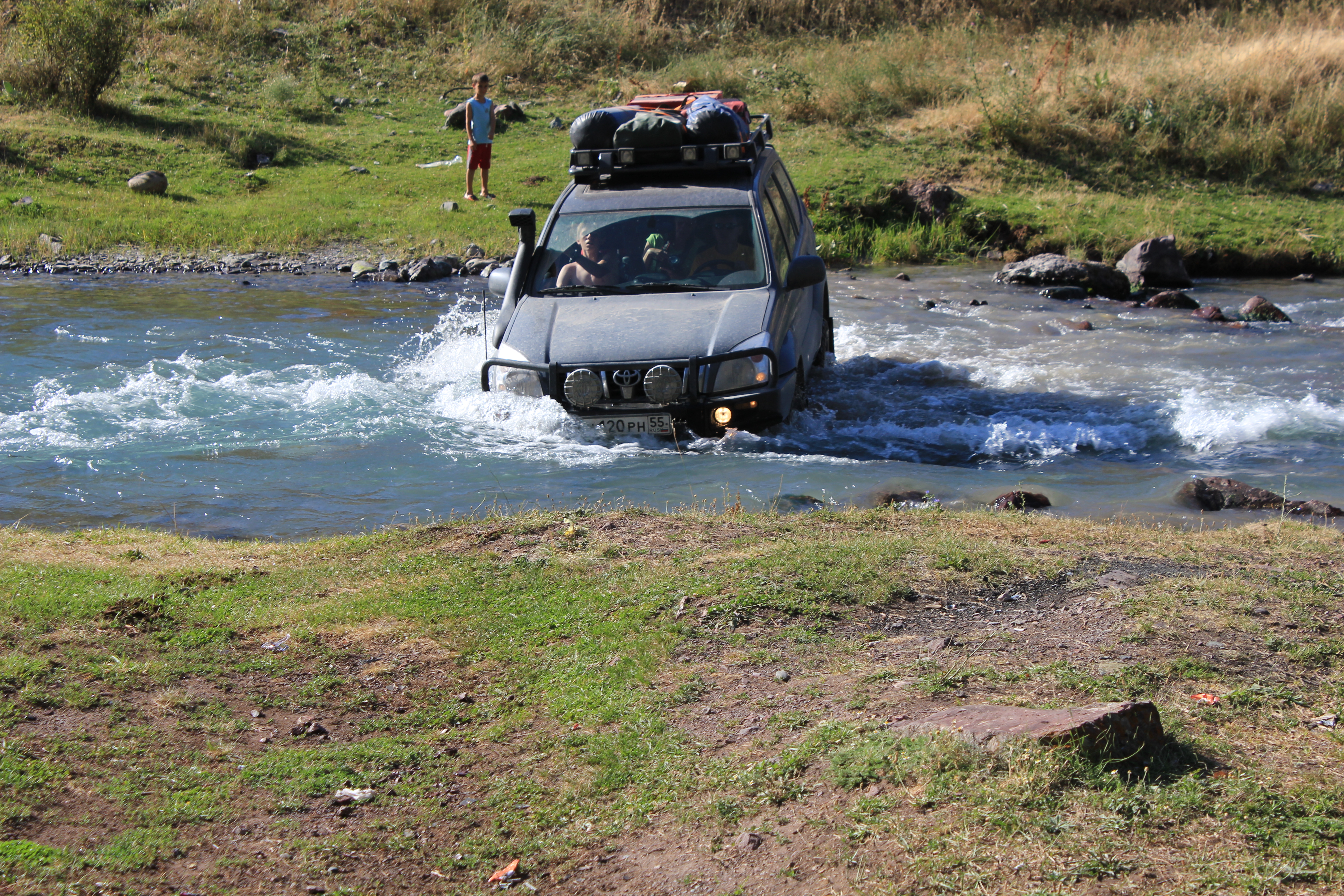 Искали место для ночёвки, взяли в брод речку, а оказалось заехали на территорию куда запускают только за деньги через шлагбаум. Выехали, я предложил пошутить, заехав ещё раз через речку и снова выехать под шлагбаум.