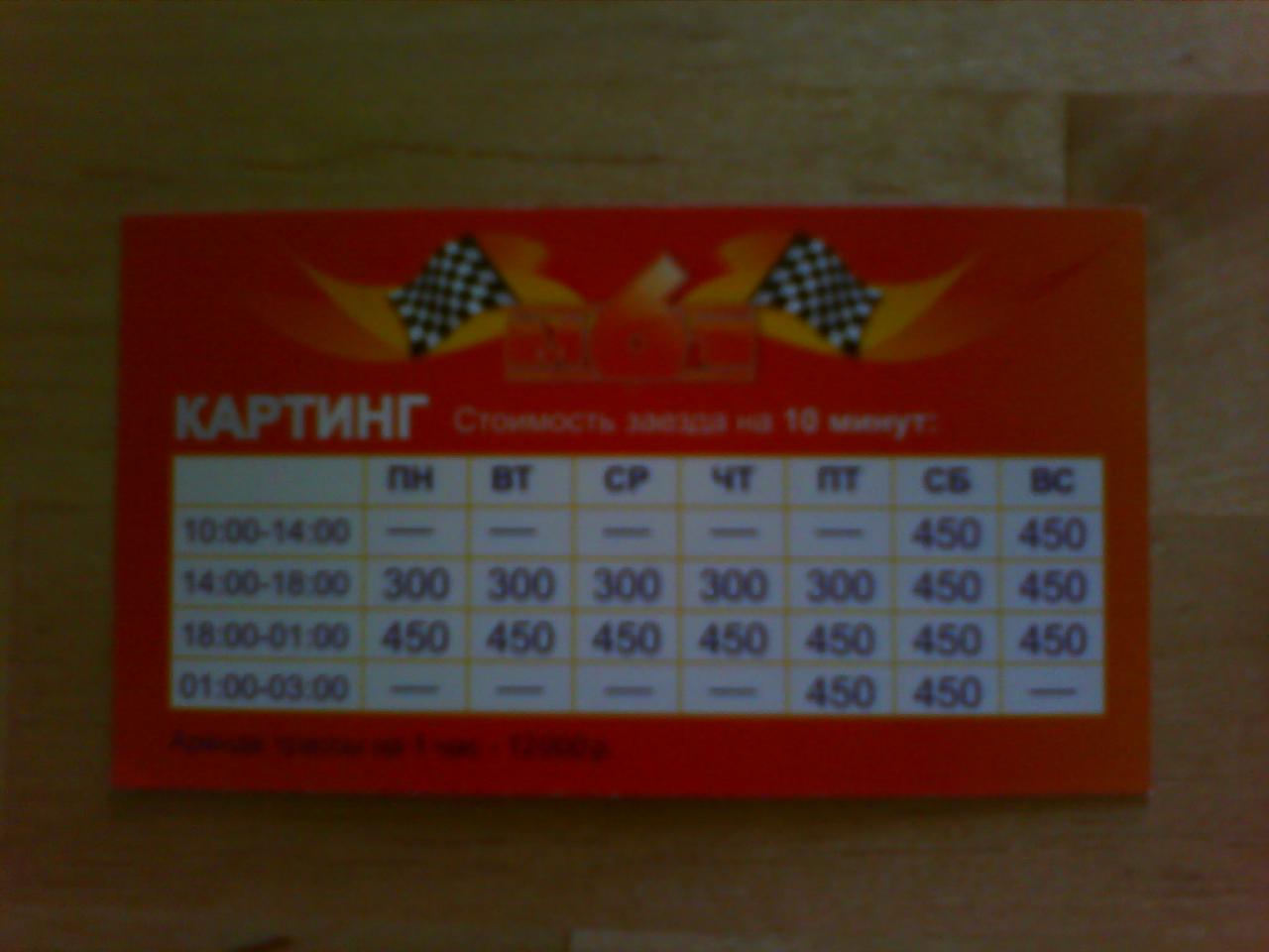 Одновременно на трассе в режиме чемпионата могут находиться пять машин, в свободных покатушках четыре. Аренда трассы на час стоит 12000 рублей, с возможностью замены пилотов. Т.е. первая пятёрка откаталась и отдыхает, их места занимает следующая пятёрка. Алкоголь исключён полностью. В комнате отдыха можно курить. Все необходимые флаги (красный, жёлтый, синий, зелёный, чёрно-белый и чёрно-белый клетчатый) есть. Провести чемпионат по всем правилам персонал комплекса нам поможет. Заезд длится 10 минут.