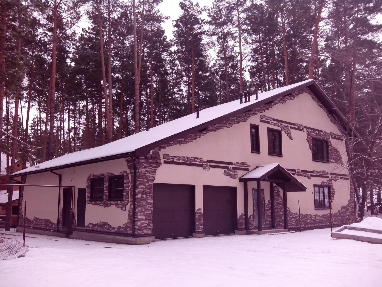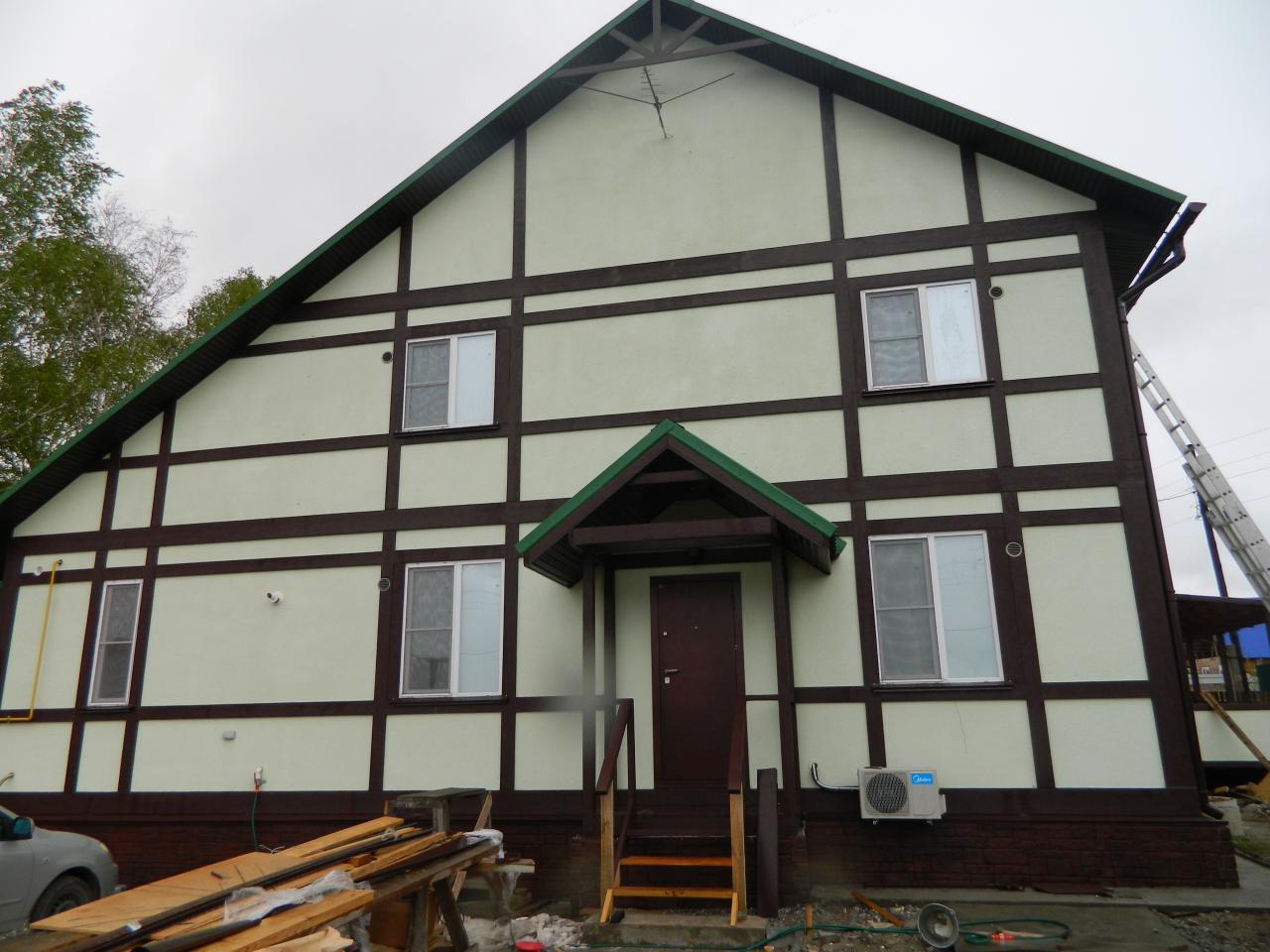 Фасад 500 тр. Вданном случае пробковая напыляемая штукатура и декор. элементы из ППС.