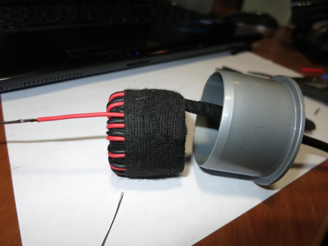 Сама обмотка состоит из 12 витков сложенным вдвое проводом диаметром 1 мм. Провод обмоточный (смотан с трансформатора), покрыт цветной термоусадкой.