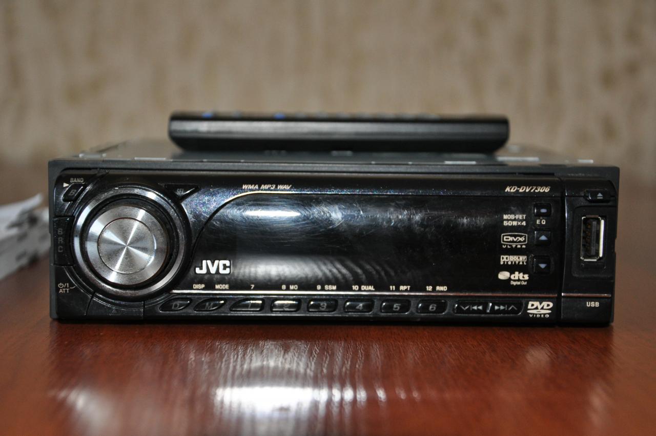 Лот 3. Автомагнитола JVC KD-DV 7306 CD/DVD-ресивер с эквалайзером, радиоприёмником, USB-входом, пультом ДУ, типоразмер 1 DIN. Максимальная выходная мощность — 4х50 Вт, форматы воспроизведения — audio CD, MP3, WMA, MPEG4, JPEG. Пробег 1 год, далее был благополучно заменён на китайскую голову 2 DIN с ТВ. Цена лота – 1000 р. (карман 1 DIN в нагрузку).