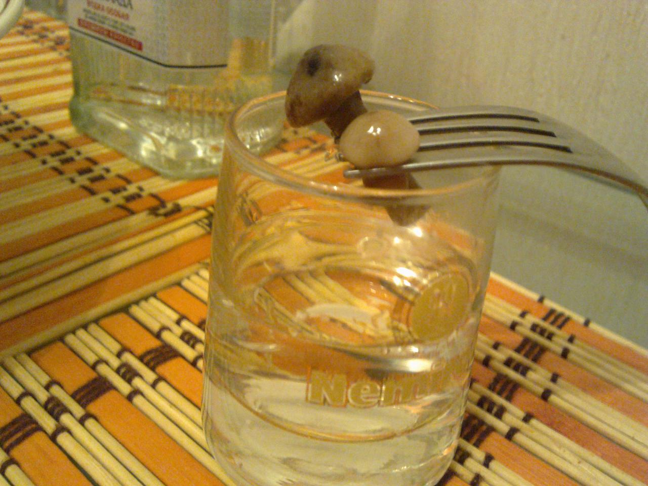 Сильно крупный план: водки стакан, а опята-переростки...